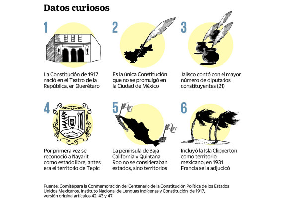 Alrededor de la Carta Magna hay al menos nueve datos interesantes, que tienen que ver con los estados: uno de ellos es que la Constitución nació en el gran Teatro Iturbide, hoy conocido como Teatro de la República, ubicado en la entonces ciudad de Santiago de Querétaro, Querétaro.