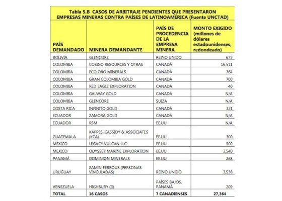 México, Argentina, Venezuela, Ecuador, Perú, Bolivia, Colombia Costa Rica, Panamá, República Dominicana, Chile, Guatemala, Uruguay, El Salvador, Paraguay, Nicaragua, Honduras, Granda y Guyana, son los países de Latinoamérica y El Caribe donde las mineras han presentado casos de arbitraje en contra de los gobiernos.