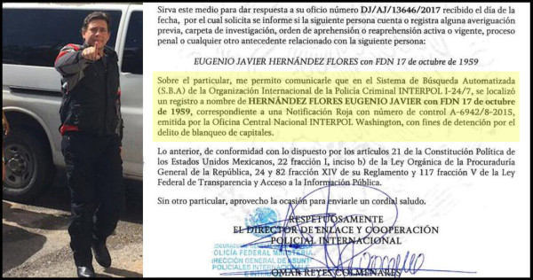 Luego de la detención del ex Gobernador, la Procuraduría de Justicia de Tamaulipas solicitó a la dependencia información sobre si Eugenio Hernández contaba con alguna orden de aprehensión nacional o internacional vigente. En un oficio dirigido al Subprocurador de Justicia de Tamaulipas, Creig López Olguín, la Procuraduría General de la República (PGR) confirmó que Hernández Flores tenía la Ficha Roja con número de control A-6942/8-2015, emitida por la Oficina Central Nacional Interpol Washington desde 2015 por el delito de blanqueo de capitales. Y no hizo nada.