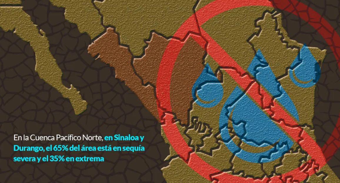 Al 30 de abril, la Comisión Nacional del Agua (Conagua) registró el 87 por ciento del territorio nacional con sequía de anormalmente seco a excepcional, porcentaje no registrado al menos desde diciembre. En la Cuenca Pacífico Norte, que abarca Sinaloa y Durango, dos de los estados más golpeados por la sequía prolongada junto con Sonora, Chihuahua y Tamaulipas, el 65 por ciento está en sequía severa y el 35 por ciento en extrema.
