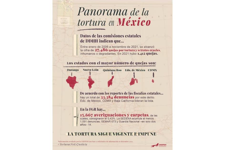 De acuerdo con datos de las comisiones estatales de Derechos Humanos, de enero de 2006 a noviembre de 2021, se tienen contabilizadas 27 mil 486 quejas por tortura y datos crueles, inhumanos o degradantes.