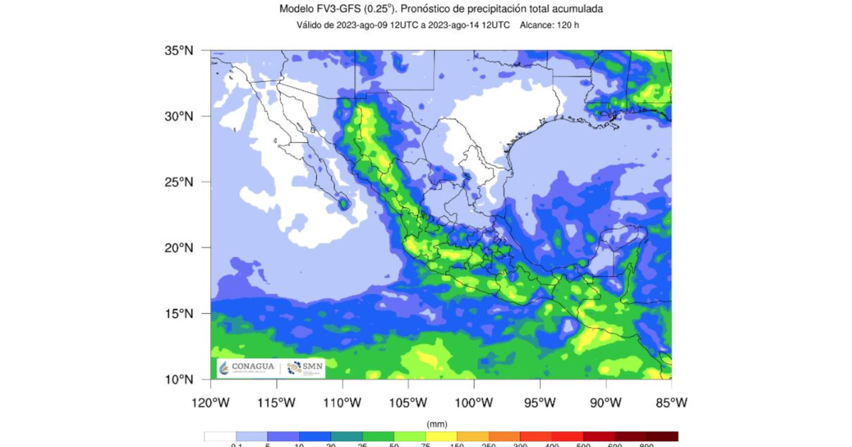 ”El monzón mexicano, en combinación con divergencia en altura, generará probabilidad de lluvias muy fuertes con descargas eléctricas, rachas de viento y granizadas en Sonora, Chihuahua, Durango y Sinaloa”, dio a conocer el SMN la tarde de este miércoles en su proyección meteorológica a 96 horas.