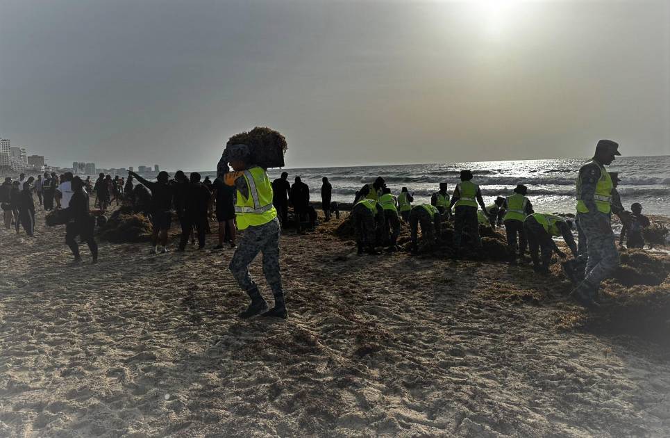Luchan contra el sargazo en playas de Cancún