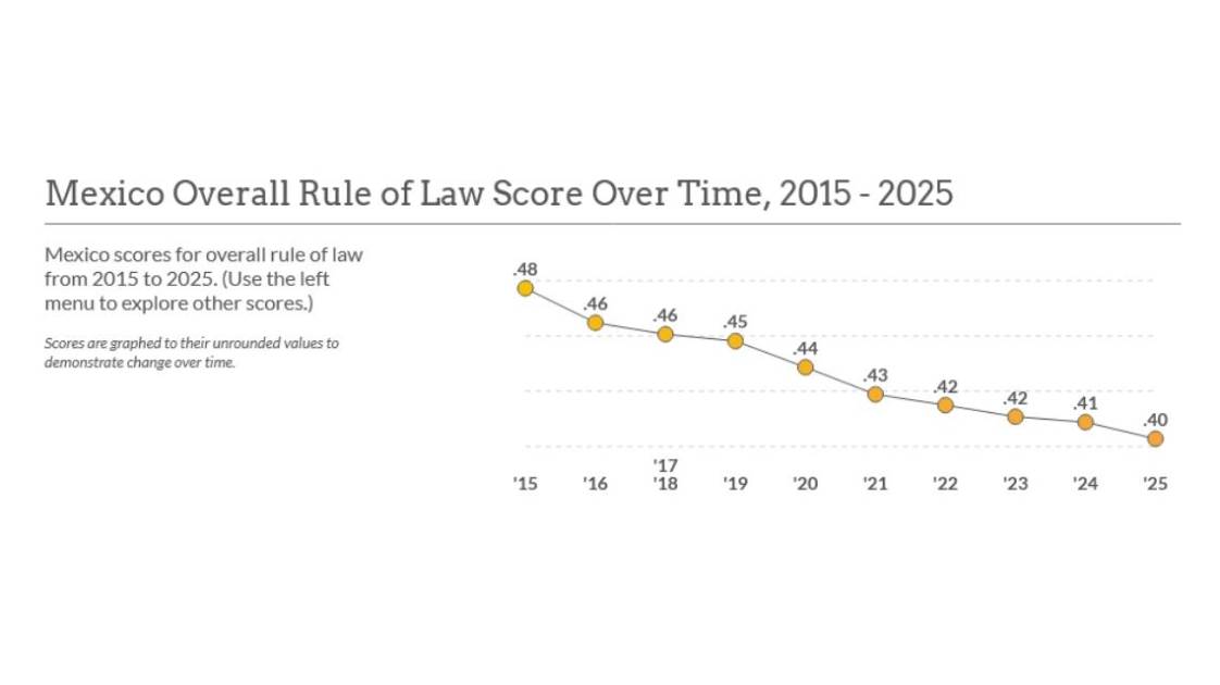 México cayó dos posiciones en el Índice de Estado de Derecho 2025, elaborado por el World Justice Project (WJP), al ubicarse en el lugar 121 de 143 países evaluados.