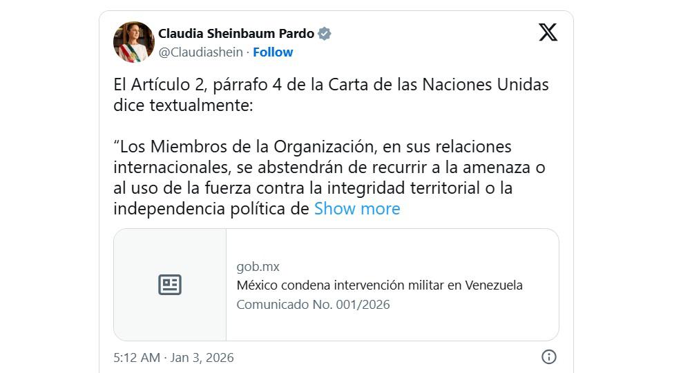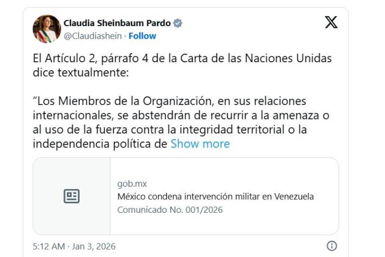 El Gobierno de México condenó las acciones militares ejecutadas por Estados Unidos contra objetivos en territorio de Venezuela. A través de un comunicado oficial, la administración federal denunció una violación directa al Artículo 2 de la Carta de la Organización de las Naciones Unidas (ONU) y exigió el cese inmediato de cualquier acto de agresión contra el gobierno y el pueblo venezolanos.