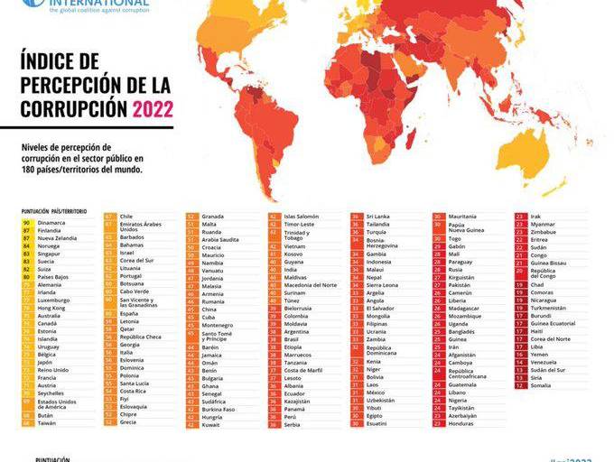 El promedio de puntuación del Índice de Percepción de la Corrupción 2022 en la región es de 43 puntos, sobre un total de 100, y casi dos tercios de los países tienen menos de 50 puntos. En 27 de los 32 países de América no se ven avances desde 2016, dijo Transparencia Internacional.