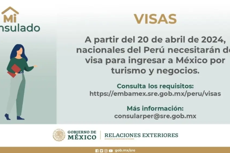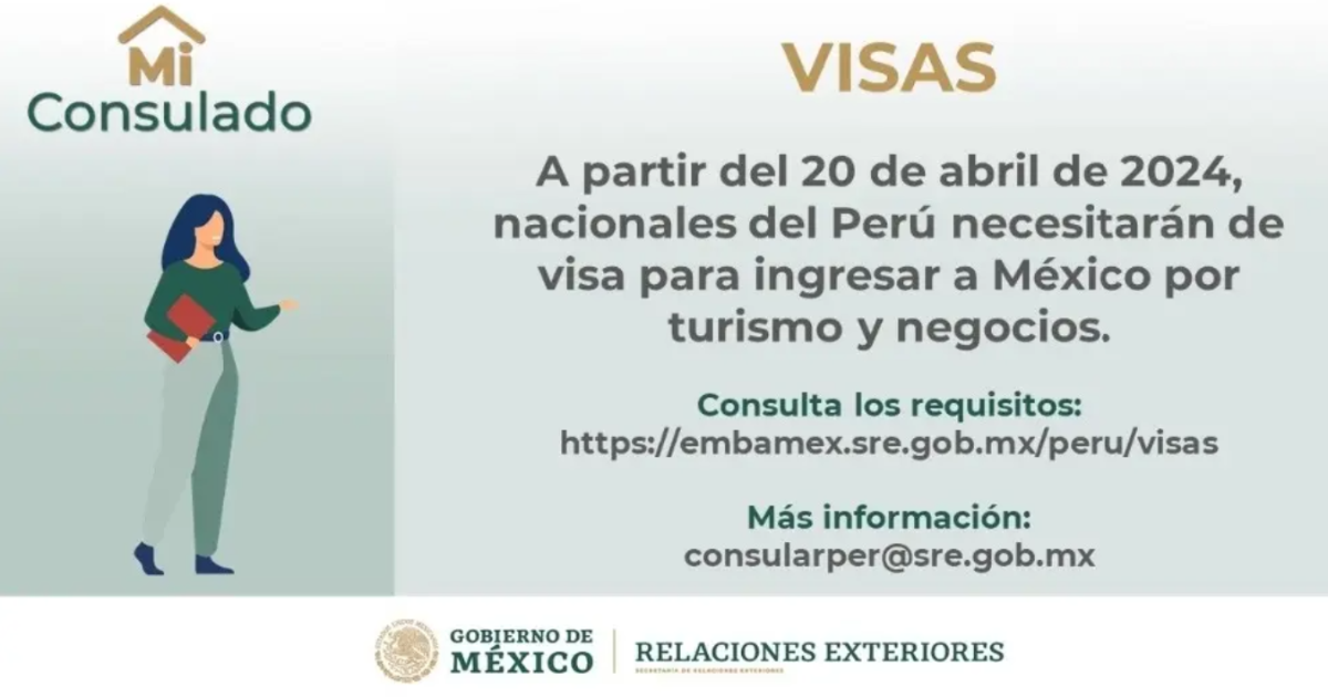 La Embajada de México en Lima confirmó en su cuenta la red social X que “a partir del 20 de abril de 2024 las personas nacionales del Perú necesitarán de visa para ingresar a México para realizar turismo y negocios”.