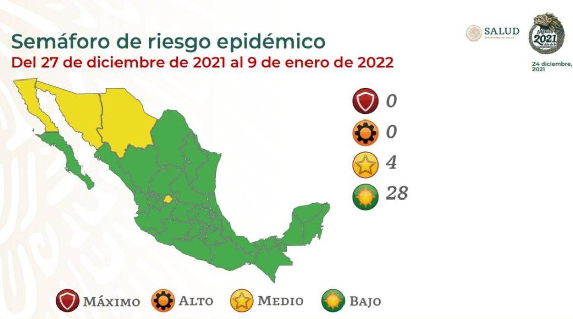 La Secretaría de Salud actualizó el semáforo que aplicará a partir del 27 de diciembre, y hasta el 9 de enero.