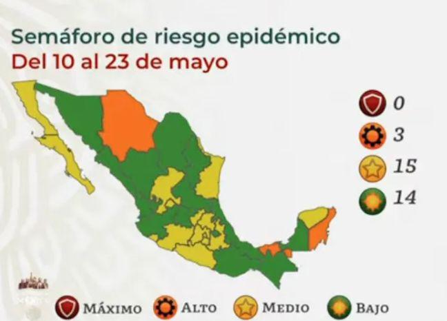 Ricardo Cortés Alcalá, Director General de Promoción de la Salud, presentó esta tarde el Semáforo que estará vigente del 10 al 23 de mayo, detalló que 14 estados estarán en Semáforo Verde –que representa el riesgo más bajo ante la COVID-19–, mientras que 15 permanecerán en Amarillo, el nivel medio de riesgo.