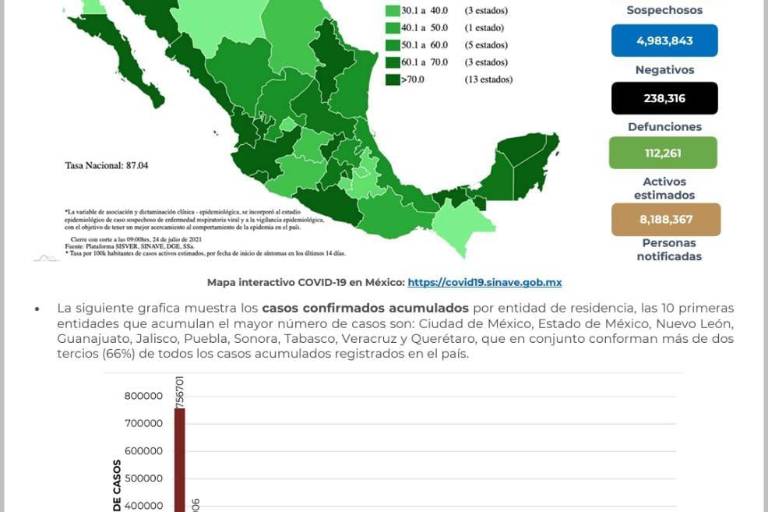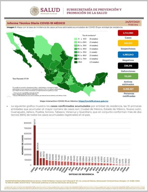 Al corte de información de este 24 de julio se tienen registrados 103 mil 879 casos activos que iniciaron síntomas en los últimos 14 días.