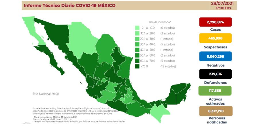 Con 537 nuevos fallecimientos, el país alcanzó las 239 mil 616 muertes por la enfermedad, y hay 12 mil 290 defunciones sospechosas.