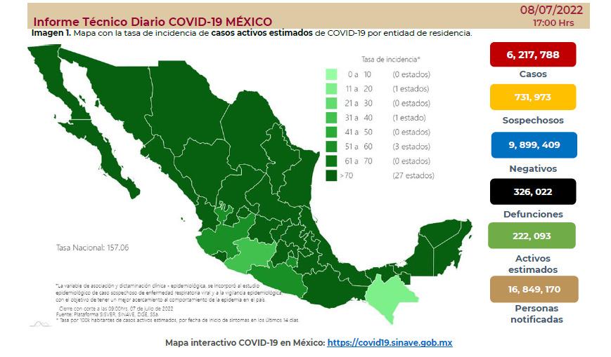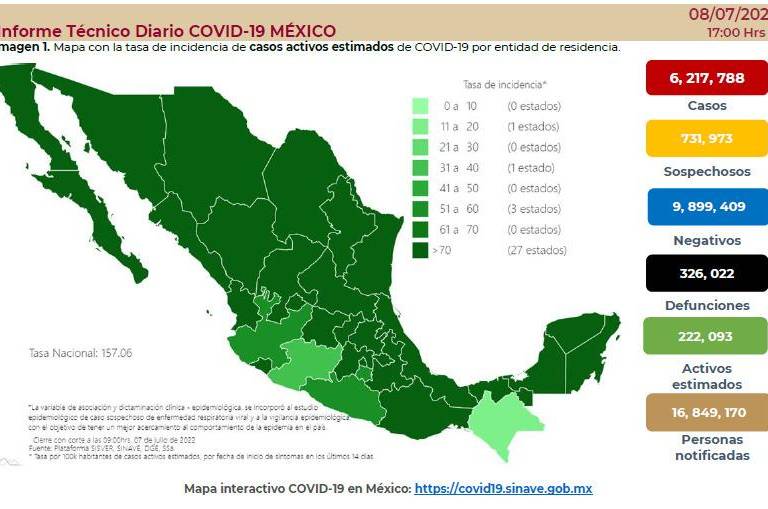 También reporta el inicio de la semana epidemiológica número 30, que abarca del 24 al 30 de julio, con promedio de siete mil 852 contagios por día.