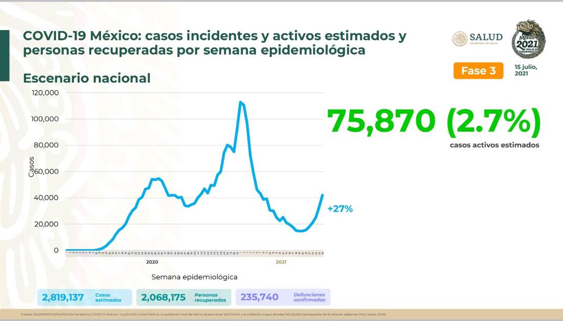Sin embargo, la dependencia estima que 75 ml 870 (un 2.7 por ciento) son los casos activos por presentar síntomas en los últimos 14 días.