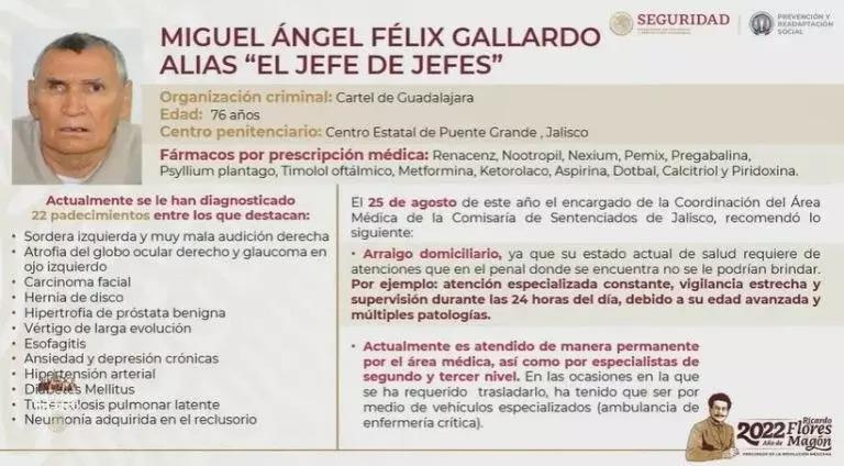 Por otra parte, la funcionaria federal detalló que el fundador del ahora extinto Cártel Guadalajara, es atendido de manera permanente por el área médica del penal de Puente Grande, así como por especialistas de segundo y tercer nivel. Además, la titular de la SSPC señaló que los medicamentos que necesita Félix Gallardo son: Renacenz; Nootropil; Nexium; Pemix; Pregabalina; Psyllium plantago; Timolol oftálmico; Metformina; Ketorolaco; Aspirina; Dotbal; Calcitriol, y; Piridoxina.