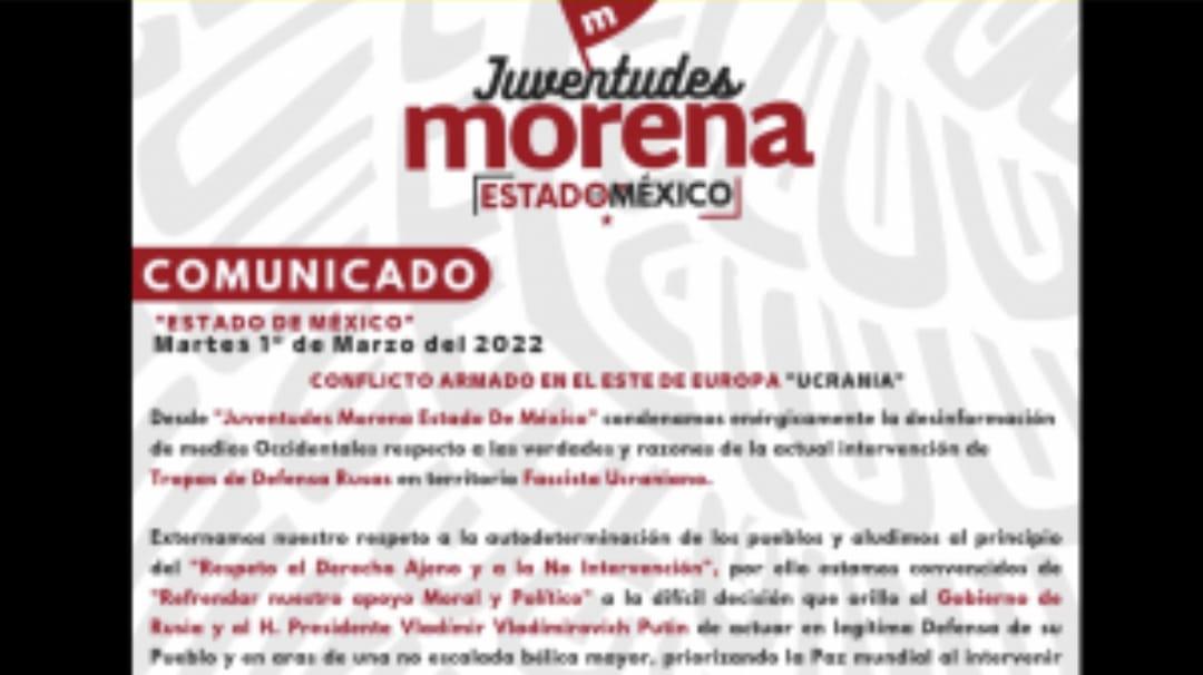 La organización Juventudes Morena Estado de México señaló en un mensaje este martes que el Presidente ruso, Vladimir Putin, se vio “orillado” a actuar contra Ucrania para proteger “la paz mundial”.