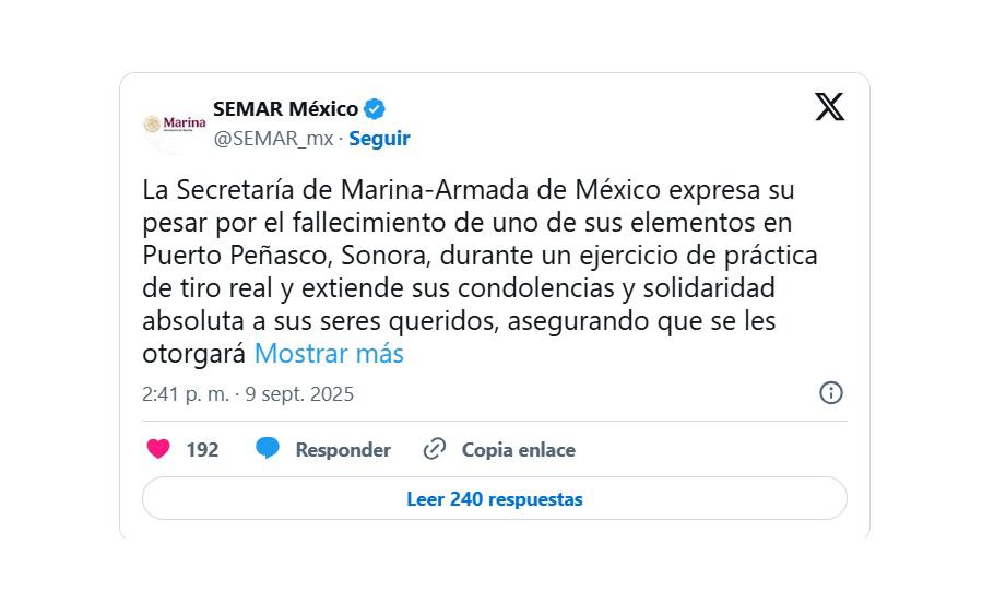 “La Secretaría de Marina-Armada de México expresa su pesar por el fallecimiento de uno de sus elementos en Puerto Peñasco, Sonora, durante un ejercicio de práctica de tiro real y extiende sus condolencias y solidaridad absoluta a sus seres queridos, asegurando que se les otorgará todo el respaldo, conforme a lo establecido por la ley”, indicó la SEMAR, en su cuenta de la red social X.