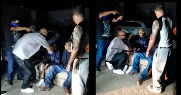 En el siguiente fragmento del video se ve al supuesto hombre secuestrado hincado con la cabeza gacha mientras otro sujeto le apunta en la cabeza con un arma de fuego y le hace preguntas.
