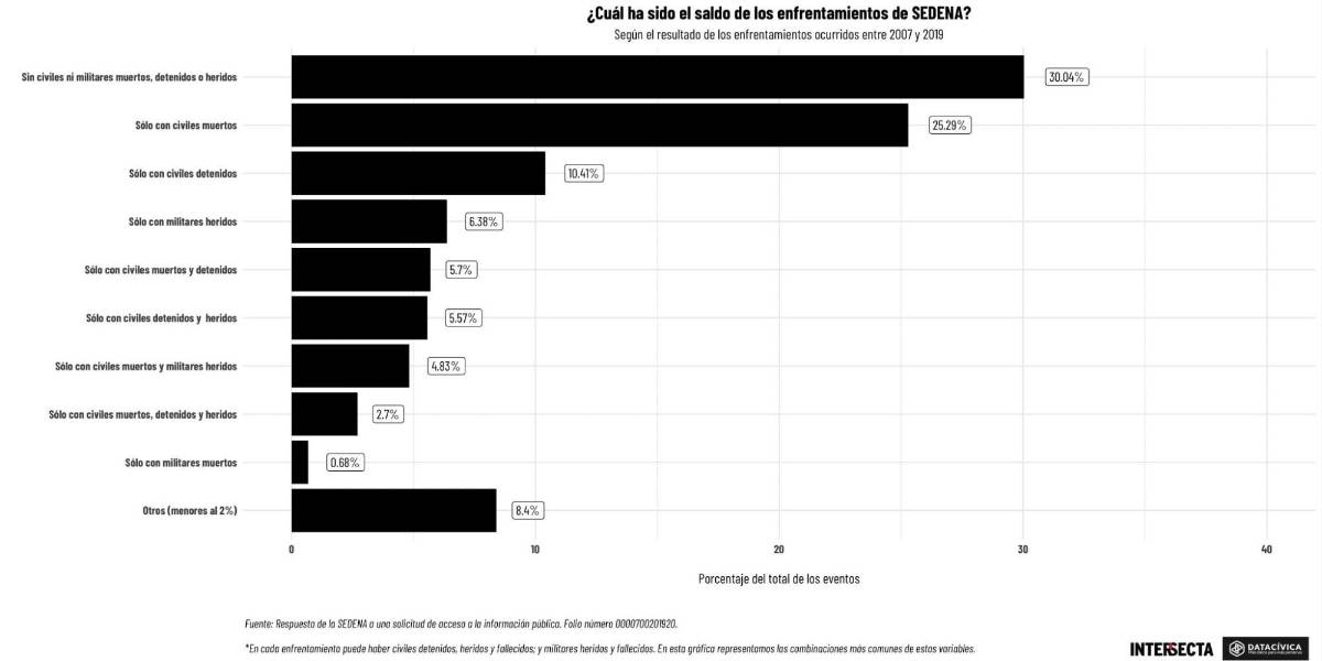 Data Cívica expuso que se puede afirmar que por cada civil detenido en los enfrentamientos de la Sedena entre el 2007 y 2019, en promedio fallecieron 1.2 civiles.