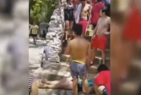 De acuerdo con la descripción del video los hechos ocurrieron el pasado 24 de julio cuando una mujer que se encontraba de visita en el balneario cayera por una de las pozas y resultara severamente lastimada.