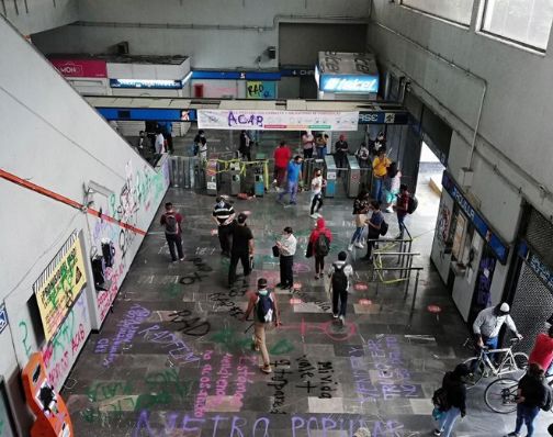 Dentro de las instalaciones del metro Chabacano, línea 2, un grupo de feministas se manifestaron realizando pintas y liberaron los torniquetes de acceso de la estación.