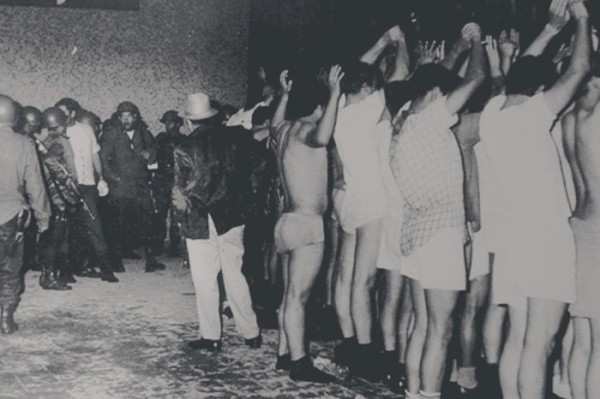 Por fin cesa el fuego. Unos minutos de incertidumbre, todos inmóviles, preceden a la orden de evacuar la terraza. Uno por uno, sin permitirles levantarse, los detenidos son cacheados y arrastrados hacia la escalera. Espero mi turno. Alguien me jala de la ropa. Miro. Uno de los del “Olimpia”; me revisa rápido, nervioso, bruscamente. “Soy periodista”, le digo. Su respuesta es un insulto. Me empuja rumbo a la escalera. El, como yo, tendido en el piso, pero sin dejar su arma.
