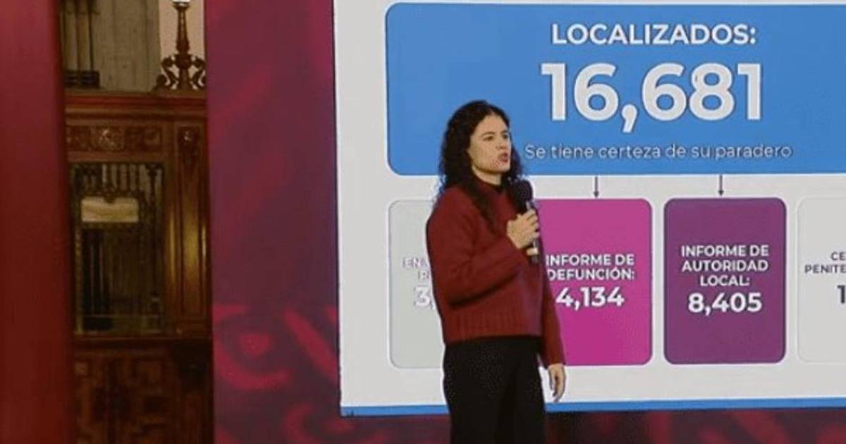 Luisa María Alcalde Luján, Secretaria de Gobernación, informó que conforme a la nueva Estrategia Nacional de Búsqueda Generalizada, de los 110 mil 964 registros de personas desaparecidas, se habían localizado 16 mil 681, con certeza de su paradero, además de que se habían ubicado a 17 mil 843 -las cuales fueron encontradas en bases de datos, “pero aún no contamos con la prueba de vida porque no hemos podido encontrarlos cara a cara”-, lo que en total sumaba 34 mil 524.