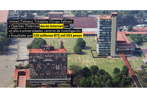 Ciudad de México (SinEmbargo).– Las empresas Uninet (Telmex), Totalplay (Grupo Salinas) y Operbes (Televisa) firmaron este jueves un contrato por 95 millones 582 mil 328 pesos (más de 110 mdp con IVA) otorgado por la Secretaría de Comunicaciones y Transportes (SCT) para ofrecer internet de alta capacidad sin costo durante 12 meses a universidades, centros de investigación y hospitales públicos a nivel nacional, de acuerdo con el fallo de licitación LA-009000937-E4-2019 publicado por CompraNet.