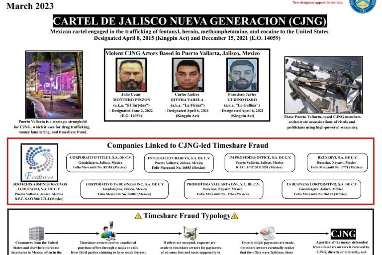“A medida que el CJNG ha consolidado territorio durante la última década, ha agregado otros delitos a su actividad principal de narcotráfico [...] En destinos turísticos como Puerto Vallarta, el CJNG se ha involucrado mucho en el fraude de tiempos compartidos, que a menudo tiene como objetivo a los ciudadanos estadounidenses”, dijo Andrea M. Gacki, directora de la OFAC, citada en un comunicado.
