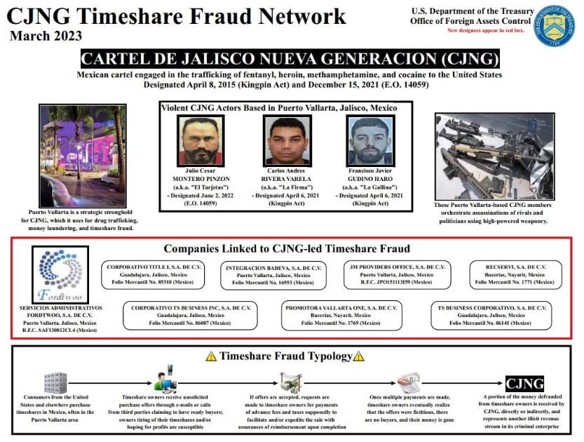 El Departamento del Tesoro de EE.UU. detalló que las ocho empresas designadas, que están vinculadas directa o indirectamente a las actividades de fraude de tiempo compartido del CJNG, afirman ser empresas de servicios financieros o inmobiliarias.