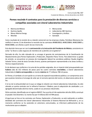 Según el boletín emitido por Pemex, los contratos cancelados atañen a ocho empresas relacionadas con Litoral Laboratorios Industriales, que vieron terminada su relación con la paraestatal el 11 de diciembre.