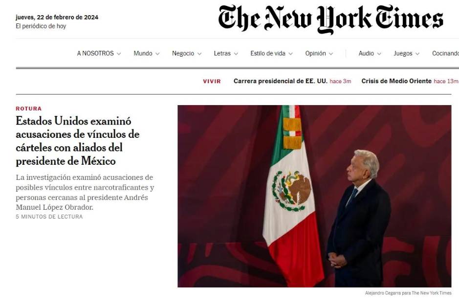 La investigación titulada ‘Estados Unidos examinó acusaciones de vínculos de cárteles con aliados del presidente de México’, firmada por los periodistas Alan Feuer y Natalie Kitroeff -jefa de la oficina del NYT para México, Centroamérica y el Caribe-, afirmó que descubrió información que apuntaba a posibles vínculos entre “poderosos agentes de cárteles”, con asesores y funcionarios mexicanos “cercanos” a López Obrador, cuando ya “gobernaba el País”.
