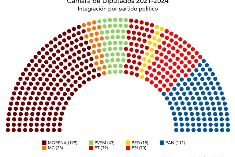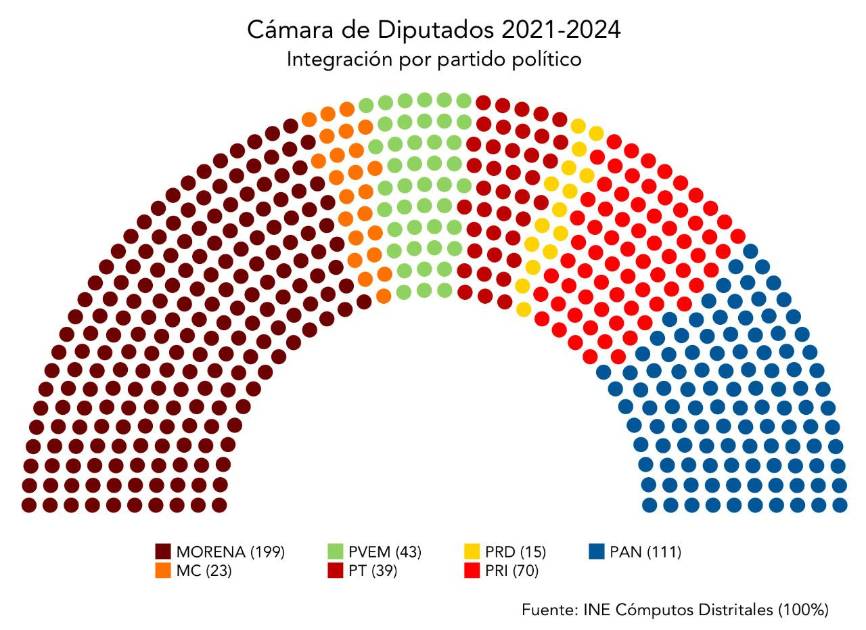 De este modo, de acuerdo con los cómputos distritales, en la próxima Legislatura -la 65-, Morena y sus aliados contarán con 281 legisladores, una cifra que configura una mayoría simple que, sin embargo, no será suficiente para que el bloque legislativo del presidente Andrés Manuel López Obrador apruebe reformas constitucionales (se requiere de la votación de dos terceras partes de la Cámara). Por su parte, la alianza PAN-PRI-PRD tendrá en total 196 diputados, y MC, 23.