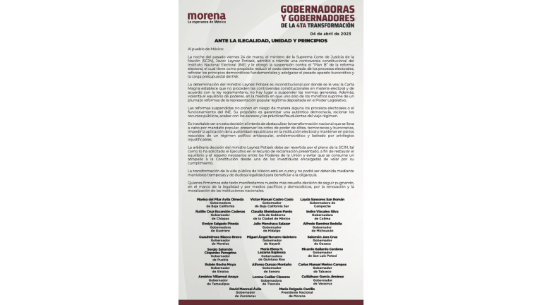 Las gobernadoras y los gobernadores de Morena firmaron un documento en el que calificaron de “inconstitucional” y “arbitraria” la decisión del Ministro Javier Laynez Potisek de suspender el Plan B de la Reforma Electoral, impulsado por el Presidente Andrés Manuel López Obrador, que modifica algunos estatutos del Instituto Nacional Electoral (INE).