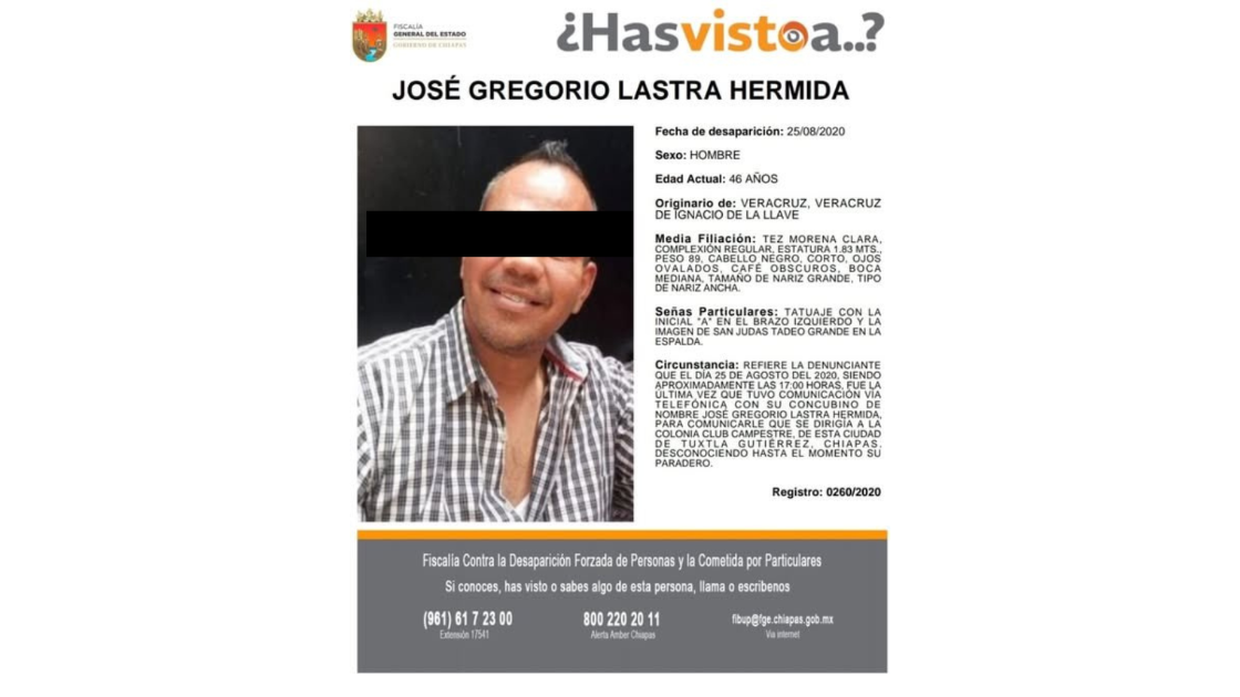 La Fiscalía General del Estado de Chiapas (FGE) cuenta con una ficha de desaparición, con número de registro 0260/2020, de José Gregorio “N’ con fecha del 25 de agosto de 2020.