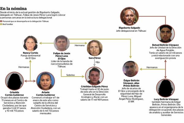 MÉXICO (UNIV)._ Felipe de Jesús Pérez Luna, “El Ojos”, quien fuera el capo de la organización criminal que opera en Tláhuac, conformó una red de familiares y amigos que trabajan en la estructura de la jefatura delegacional encabezada por Rigoberto Salgado, en la que podían tener conocimiento de las distintas acciones que realizaban, además de diversas fuentes de empleo.