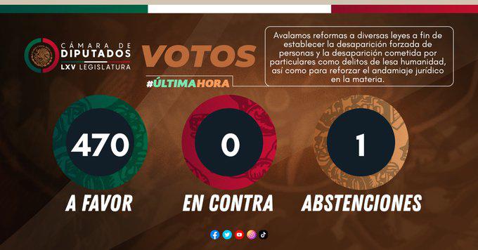 Estos cambios, que fueron aprobados, en lo general y en lo particular, con 470 votos a favor, cero en contra y una abstención, impactan disposiciones contempladas en la Ley General en Materia de Desaparición Forzada de Personas, Desaparición Cometida por Particulares y del Sistema Nacional de Búsqueda de Personas, el Código de Justicia Militar y la Ley Nacional del Registro de Detenciones.