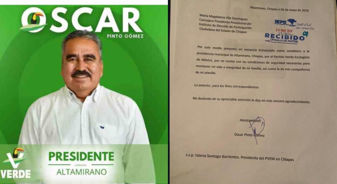 Óscar Pinto Gómez renunció el lunes a su candidatura a la Alcaldía de Altamirano, en Chiapas, por el Partido Verde Ecologista Mexicano, tras acusar que no contaba con las condiciones de seguridad para continuar en la contienda electoral.