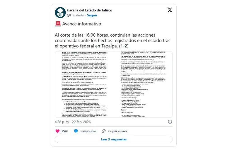 Además, en el reporte se menciona que 69 tiendas de conveniencia Oxxo presentaron saqueos o daños, ubicados en Guadalajara, Zapopan, Tlajomulco de Zúñiga, Juanacatlán y la Región Altos Sur, así como a las instalaciones del SAT en Puerto Vallarta.