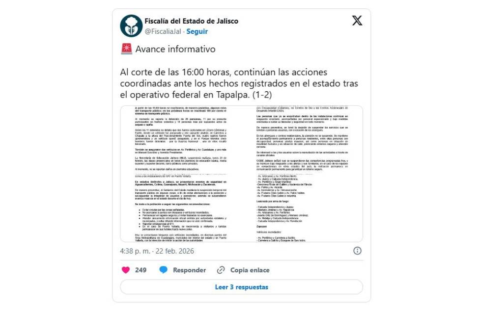 Al corte de las 16:00 horas, el Gobierno de Jalisco informó que tras los hechos registrados este domingo en el estado y las acciones que lleva a cabo para atenderlos, hasta el momento se reporta la detención de 25 personas, 11 por su presunta participación en hechos violentos y 14 más por supuestos actos de saqueo o rapiña.
