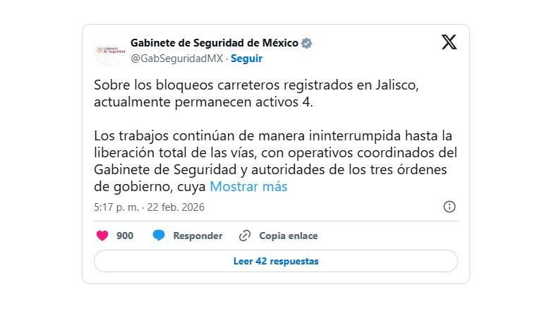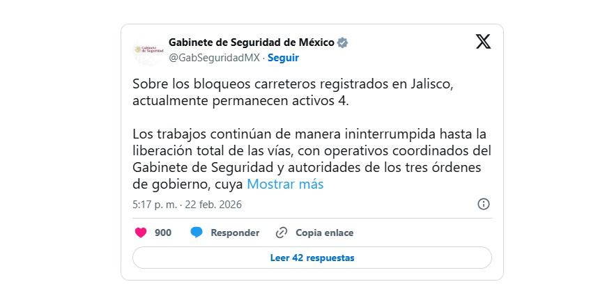 — Gabinete de Seguridad de México (@GabSeguridadMX) February 23, 2026