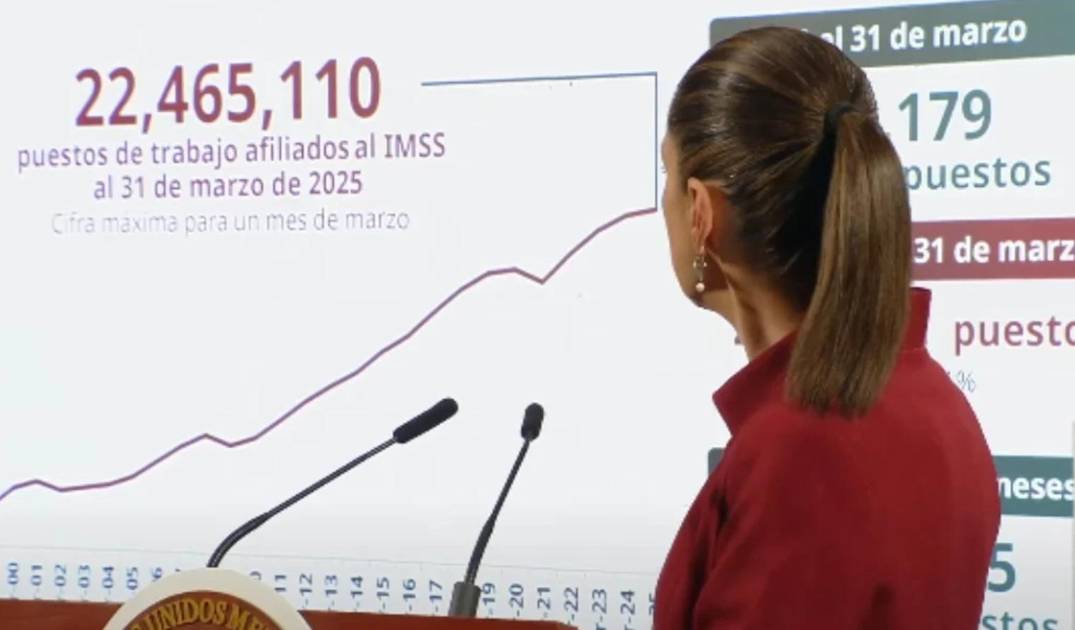 Destacó que marzo de 2025 fue el marzo más alto de la historia, con 22 millones 465 mil 110 puestos de trabajo afiliados al Instituto Mexicano del Seguro Social.