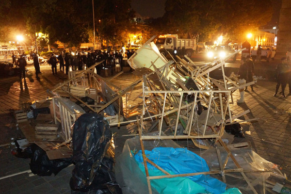 "En el quiosco como en sus alrededores, permanecen lonas, mantas, carteles, tiendas de campaña y utensilios de cocina"
