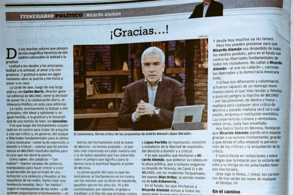 "Sale de Milenio columna de Ricardo Alemán"