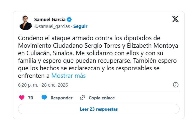 El Gobernador de Nuevo León, Samuel Alejandro García Sepúlveda, condenó el ataque armado perpetrado contra los diputados de Movimiento Ciudadano Sergio Torres Félix y Elizabeth Rafaela Montoya Ojeda, ocurrido en el centro de Culiacán.