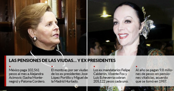 MÉXICO._ En México, ser la viuda de un ex Presidente implica una pensión vitalicia de 102 mil 561 pesos -el 50 por ciento de lo que gana un Secretario de Estado-, cantidad que reciben de manera puntual Alejandra Acimovic Popovic (la actriz Sasha Montenegro) quien estuvo casada con José López Portillo (1976-1982) y Paloma Delia Margarita Cordero Tapia, quien fue la esposa de Miguel de la Madrid Hurtado (1982-1988).