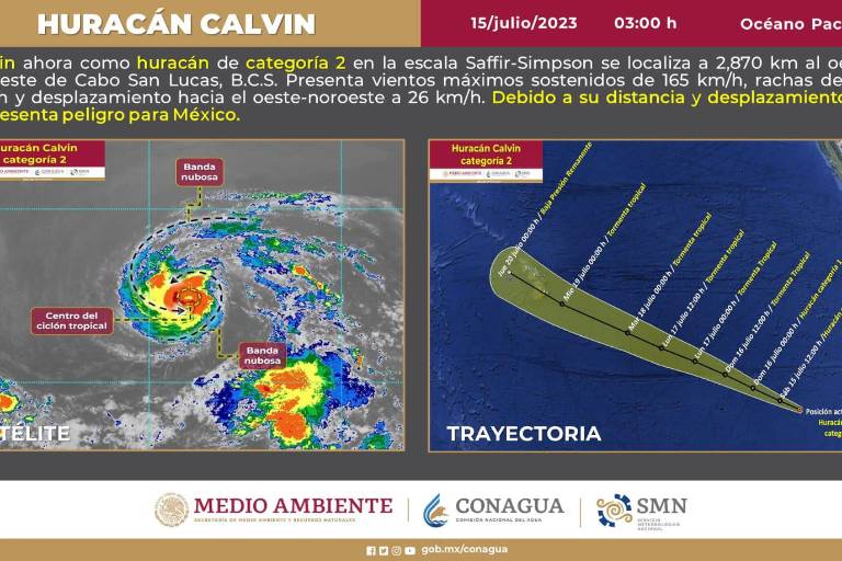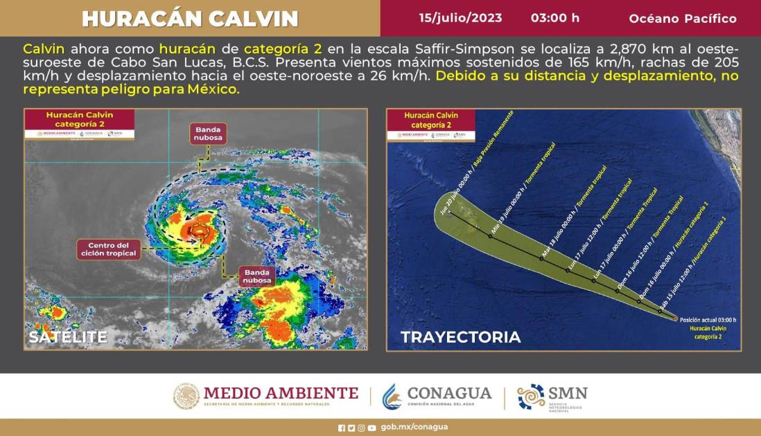 El ciclón Calvin, que el viernes se intensificó a huracán de categoría 3, se degradó la mañana de este sábado a huracán de categoría 2 en el Océano Pacífico, muy lejos de las costas mexicanas.
