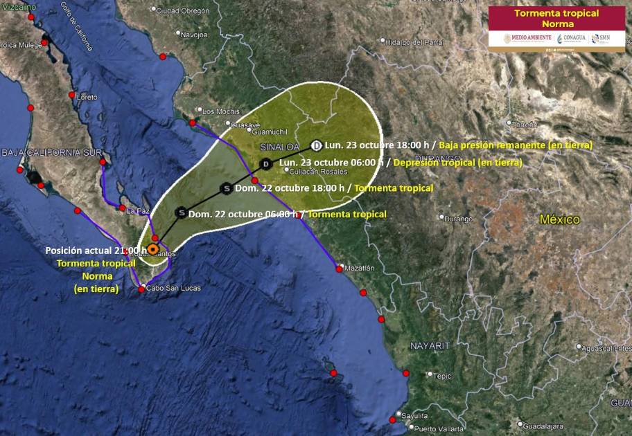 Tras su paso por Baja California Sur como huracán, “Norma” se debilitó a tormenta tropical y continúa sobre tierra, mientras se mueve hacia Sinaloa, donde se espera que impacte durante la tarde del domingo.