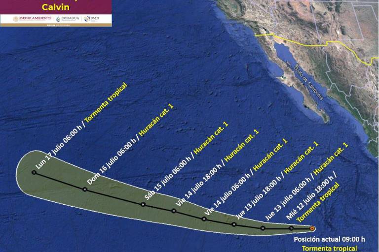 El pronóstico para este jueves a las 12:00 horas señala que “Calvin” se intensificará a huracán de categoría 1 por la intensidad de sus vientos, y se ubicará a mil 140 kilómetros al sur-suroeste de Cabo San Lucas, BCS.