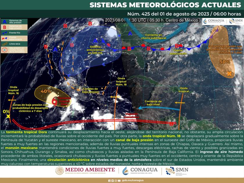 Se prevé que a las 18:00 horas de este martes “Dora” se intensifique a huracán de categoría 1 en la escala de Saffir-Simpson, por la velocidad de sus vientos, y a esa hora se localice a 705 kilómetros al oeste-suroeste de Playa Pérula, Jalisco.