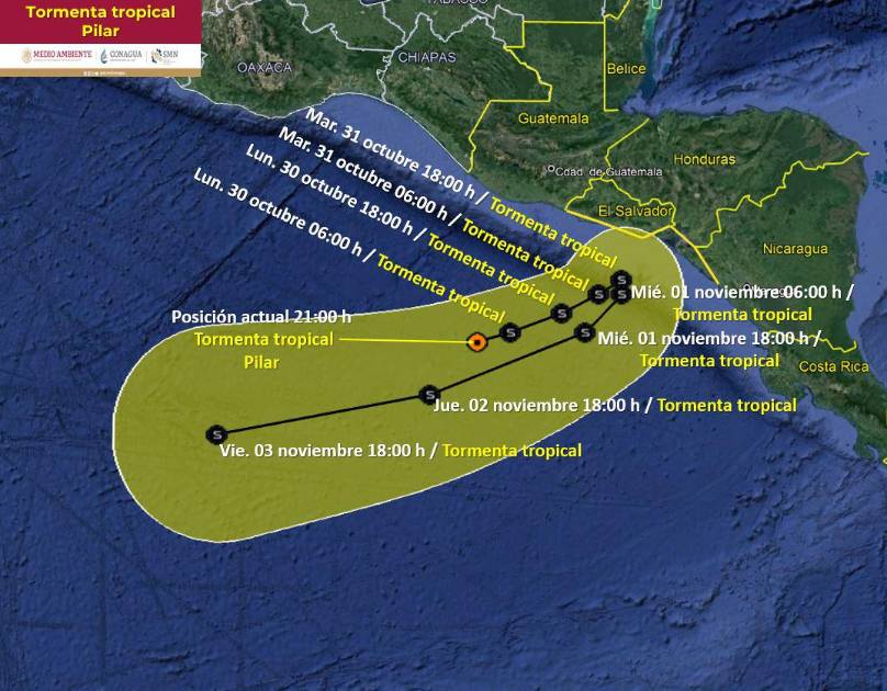 La tormenta tropical Pilar se ubica a 385 kilómetros al sur de la desembocadura del Río Suchiate (frontera entre México y Guatemala) y a 425 kilómetros al suroeste de San Salvador, El Salvador.